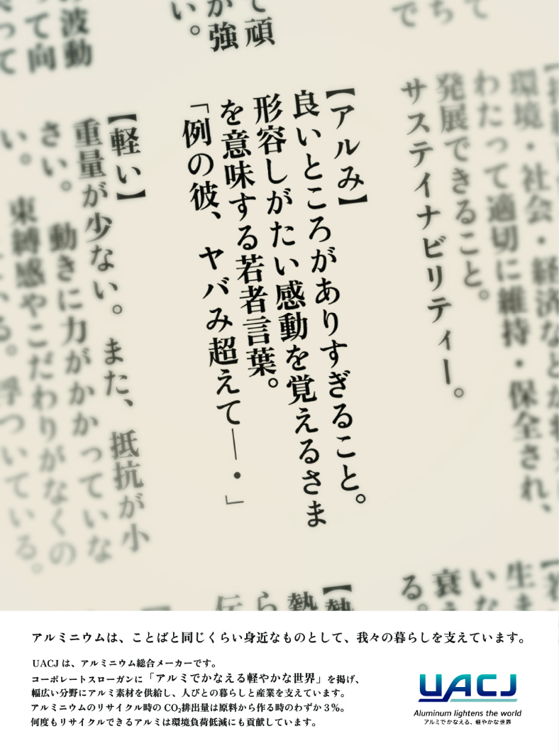 再生可能な資源であるアルミニウムの特長をフックとして、環境負荷低減に貢献できる素材であることを訴求し、当社の企業認知を向上させるための企業広告を募集します。