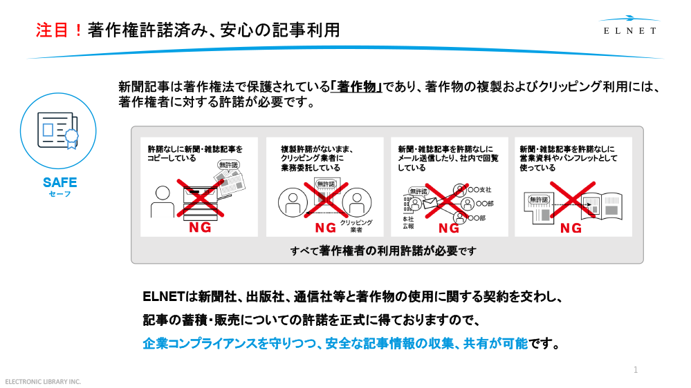 ELNETは、新聞約100紙、雑誌約30誌、Webニュース約1,000サイトから、必要な記事だけを選び、著作権許諾済みの状態で配信する唯一無二のサービスです。