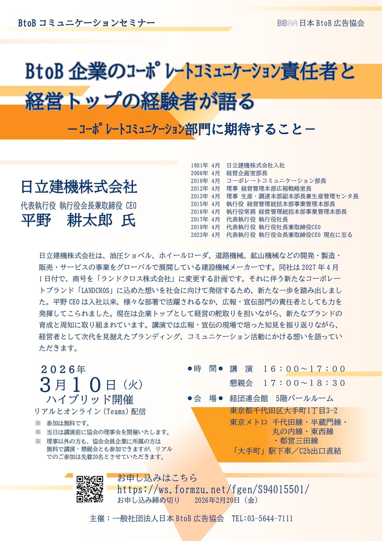 BtoBコミュニケーションセミナー「BtoB企業のコーポレートコミュニケーション責任者と経営トップの経験者が語る ―コーポレートコ ミュニケーション部門に期待することー」 2026年3月10日に「BtoB企業のコーポレートコミュニケーション責任者と経営トップの経験者が語る ―コーポレートコミュニケーション部門に期待することー」を開催しました。