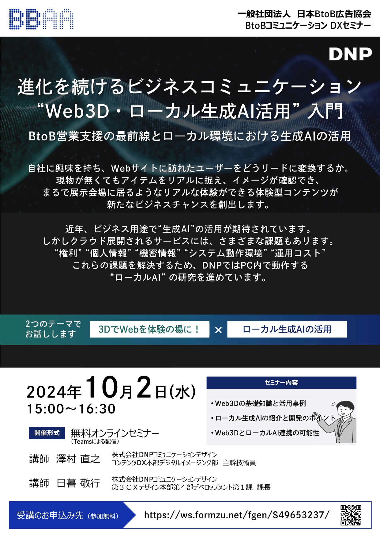 BtoBコミュニケーションDXセミナー「進化を続けるビジネスコミュニケーション『WEB3D・ローカル生成AI活用入門』」 2024年 10月 2日に「進化を続けるビジネスコミュニケーション『WEB3D・ローカル生成AI 活用入門』」を開催しました。